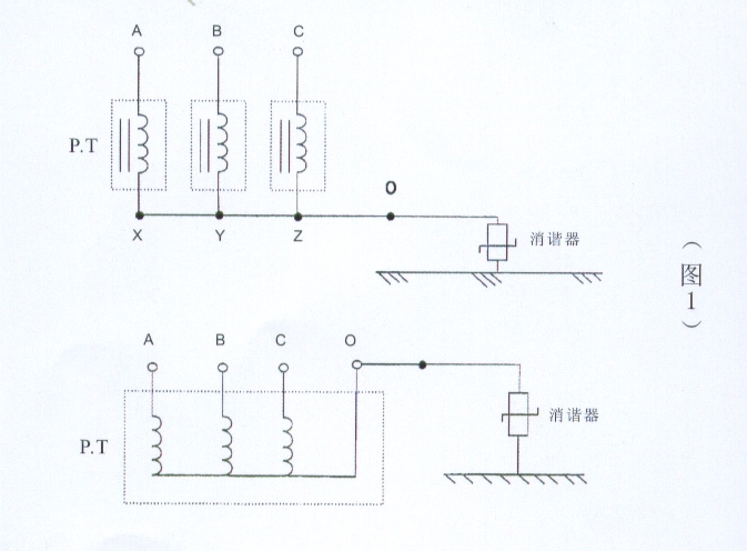 接消諧器時(shí),必須將直接接地的高壓繞組尾或(0)與地?cái)嚅_(kāi)。消諧器接在中性點(diǎn)(0)與